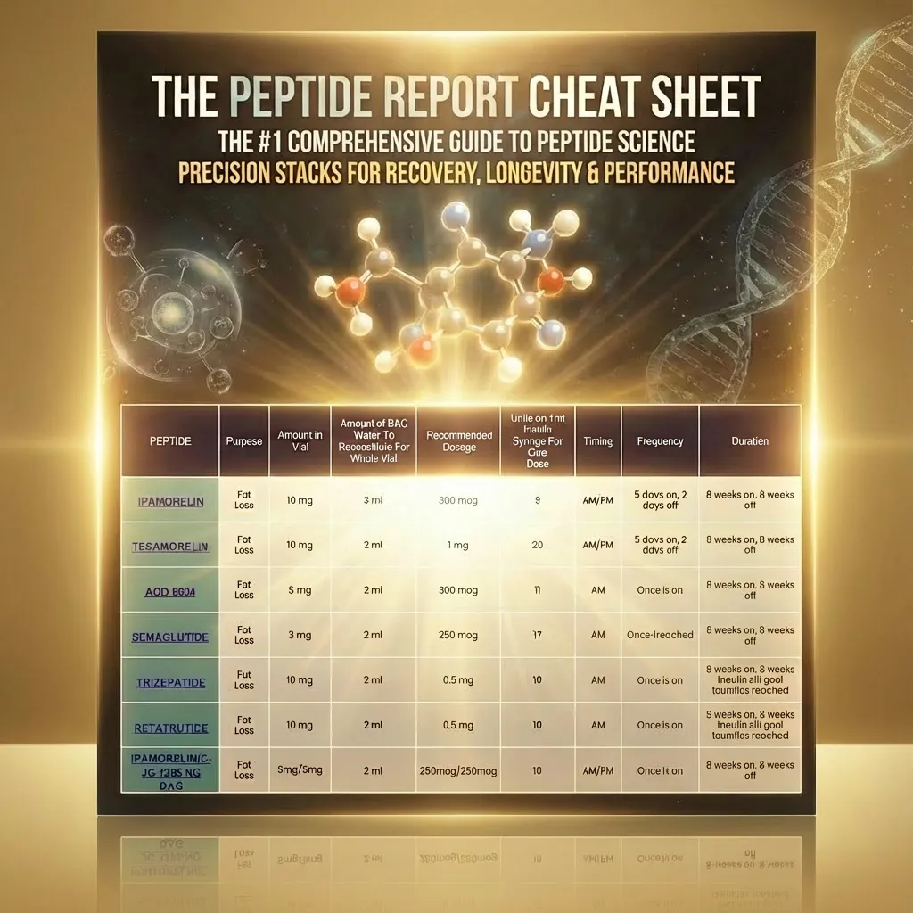 Stop piecing together peptide protocols from 47 different Reddit threads. Every dosage, timing, and frequency for 30+ peptides in one simple chart.